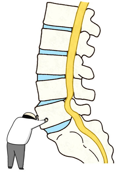 - 脊柱管狭窄症➡神経の通り道(脊柱管)が狭くなって圧迫している状態