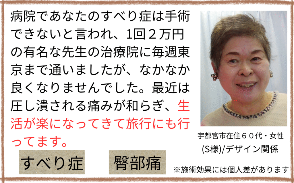 - 「強いすべり症」といわれたが施術やセルフケアで症状が緩和し旅行に行けるようになった