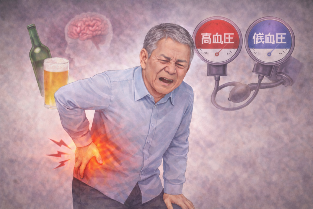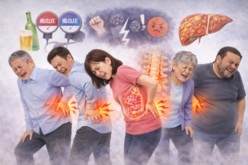 特に、検査で異常が見つからないのに続く強い腰痛では、膵炎や膵臓がんなど、膵臓の病気が隠れていることもあるとされています。