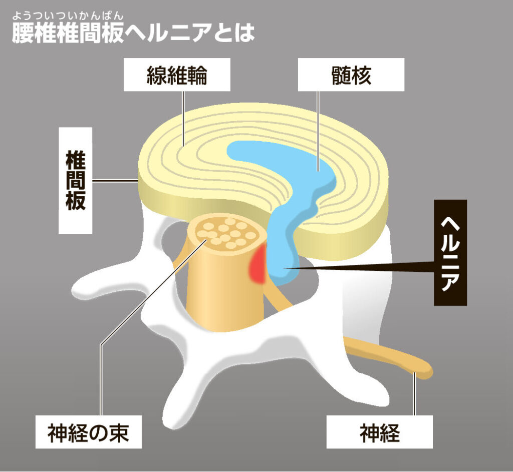 - 椎間板ヘルニア(ついかんばんへるにあ):クッションがはみ出して神経を刺激する状態。