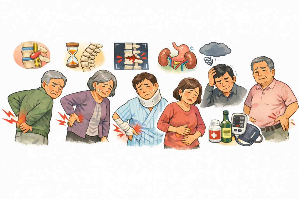 - 産後の腰痛:出産後の骨盤まわりの変化や育児動作の負担が重なる腰痛。