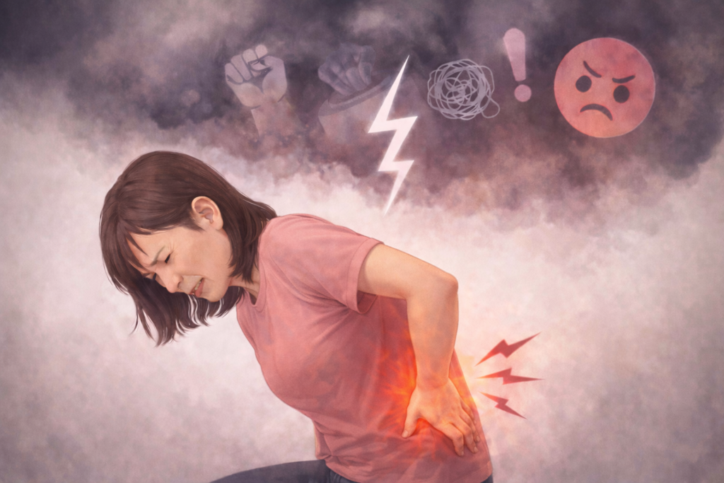 心因性腰痛(しんいんせいようつう)とは、ストレスや気分の影響で腰に痛みが出る。