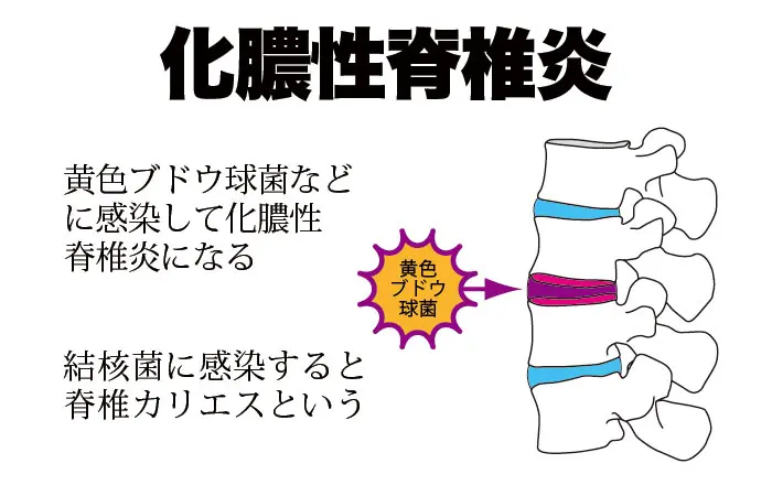 - 脊椎炎(せきついえん):背骨に炎症が起こる。