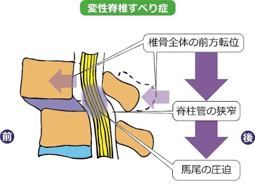 - 脊椎すべり症(せきついすべりしょう):背骨が前後にずれている状態。