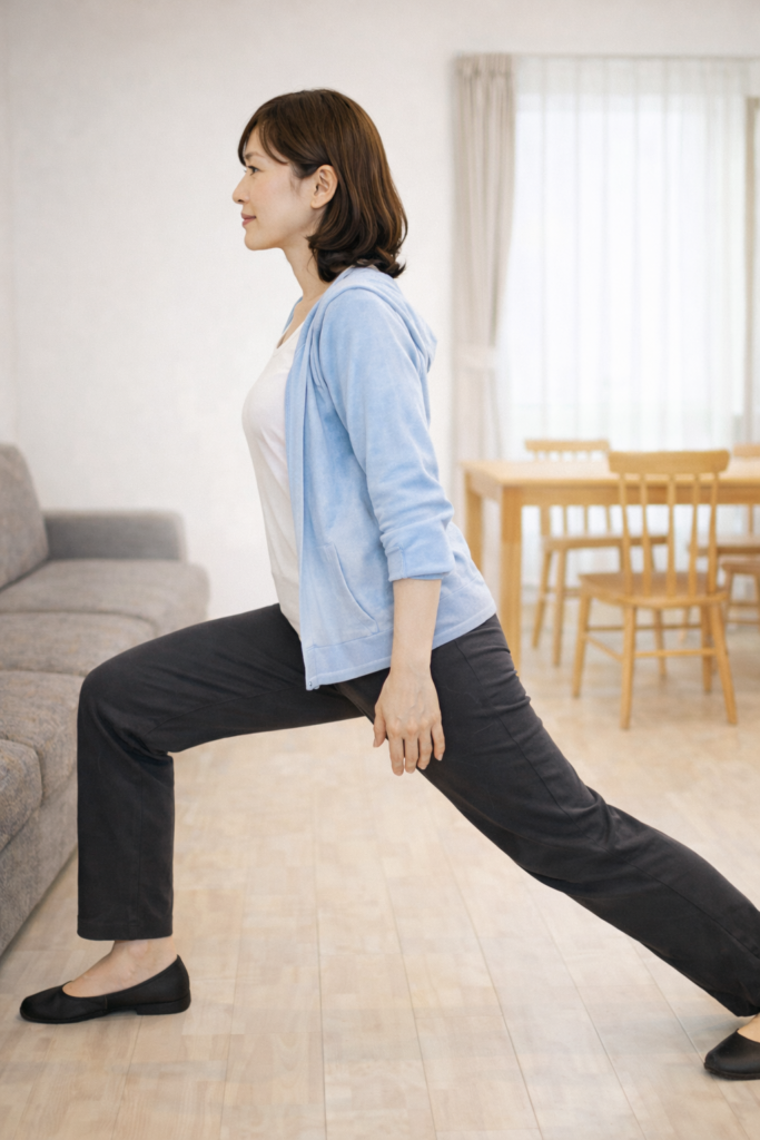 - 足を前後に大きく開いて立ちます。前の膝を軽く曲げ、後ろ脚は伸ばします。背中を丸めず、体をまっすぐ前へ移動させます。後ろ脚の足の付け根の前がじんわり伸びれば正解です。歩くときに出にくい股関節の後ろへの動きを取り戻し、前側への集中を減らします。