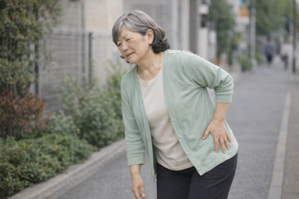 かばい続けると、反対側や腰に負担が移ることがあります。無理をしない範囲で、できるだけ左右差を減らす歩き方を意識することが大切です。