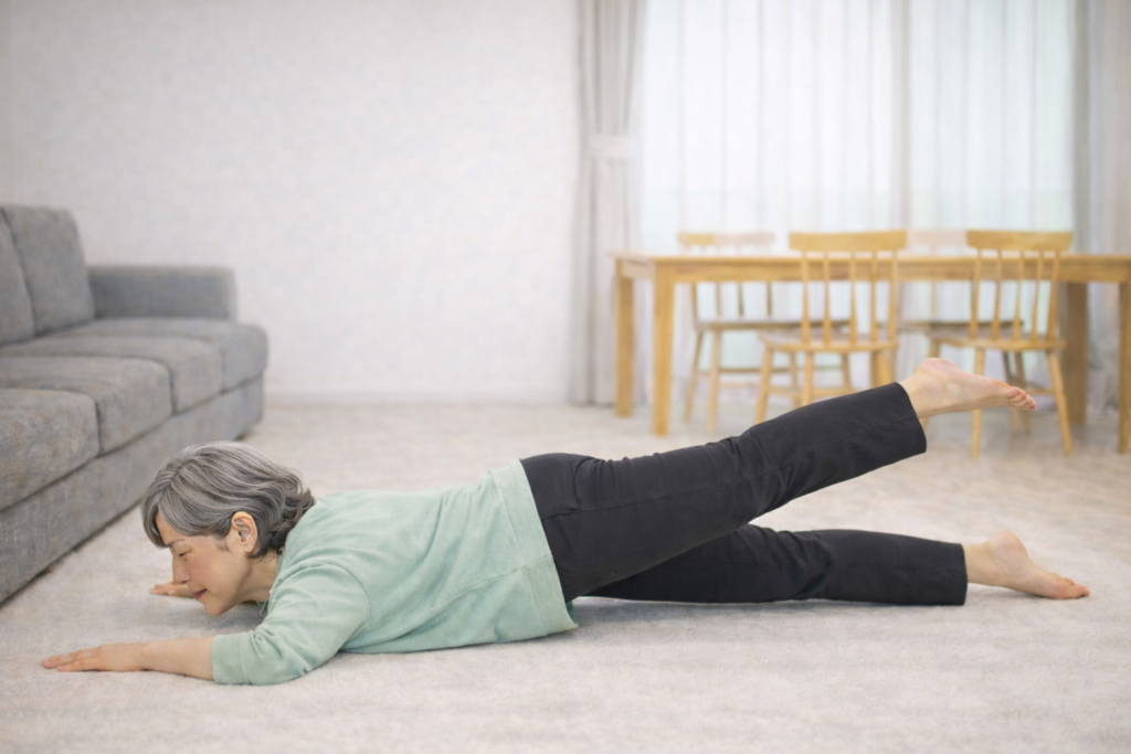 - うつ伏せに寝て、片脚をまっすぐのままゆっくり持ち上げます。腰を反らせず、お尻の筋肉を使う意識で行います。前側で踏ん張る癖を減らし、お尻で支える感覚を作ります。
