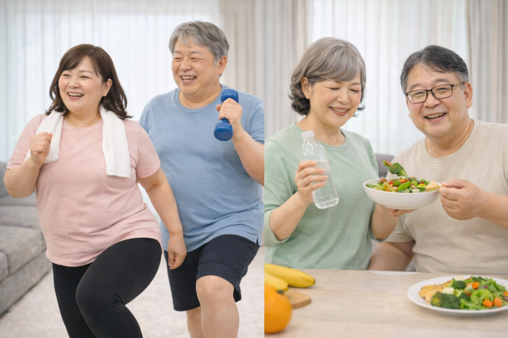 体重管理は大切ですが、それだけで前面の詰まりが解消するとは限りません。関節の位置や筋肉の使い方も同時に整えることが重要です。