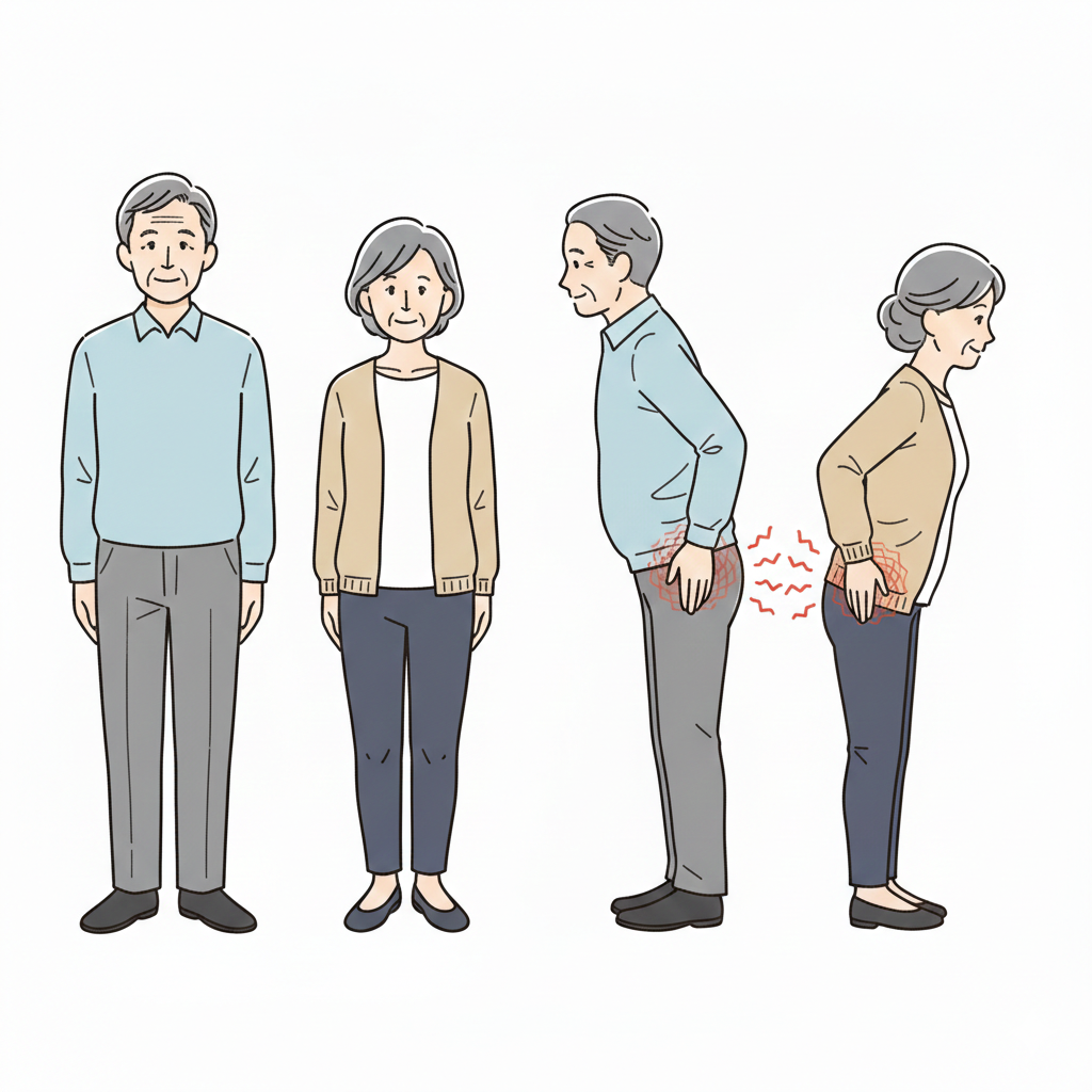 - 加齢により筋肉や関節の質が変わることも影響します。変性(へんせい:性質が変わること)が少しずつ進むと、衝撃をやわらげる力が落ち、同じ動作でも負担を感じやすくなります。