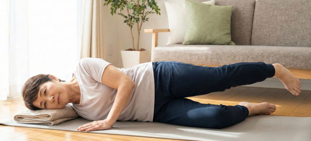 - 横向きに寝て、上の脚をやや後ろへ引いた位置で持ち上げます。つま先は少し内側へ向けます。股関節の後ろ外側を使うことで、関節の安定を高めます。
