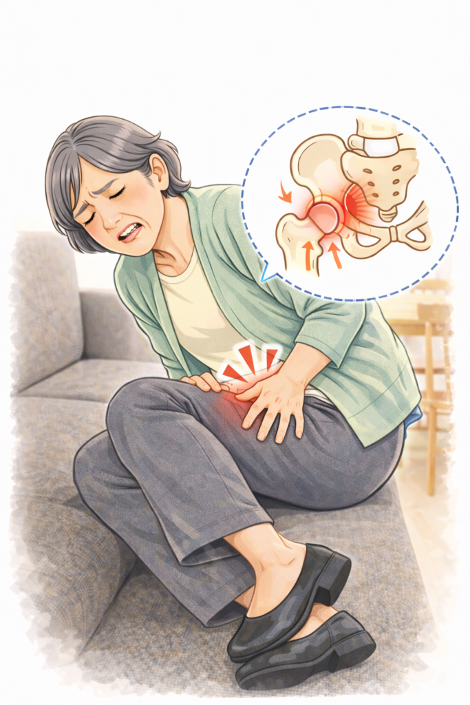 ✅椅子から立ち上がるとき、足の付け根の前がズキッと痛み、一瞬体が止まってしまう。