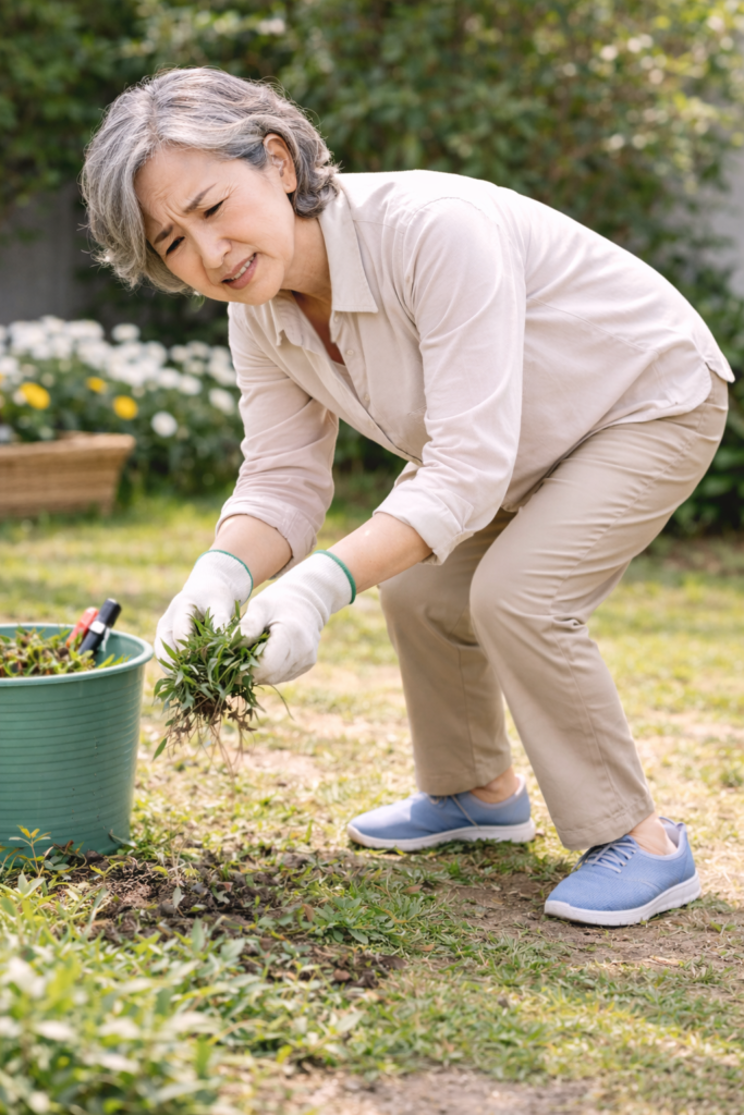 - 床の物を拾う、洗濯物を干す、庭作業などで腰だけを曲げると、仙腸関節に負担がかかります。お尻を少し後ろへ引き、股関節から体を折る意識を持つだけでも負担は減ります。