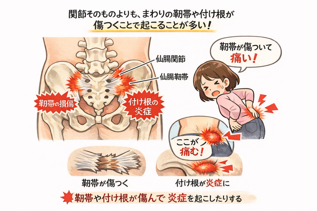 仙腸関節の痛みは、関節そのものよりも、まわりの靱帯や靱帯の付け根が傷つくことで起こることが多いと考えられています。