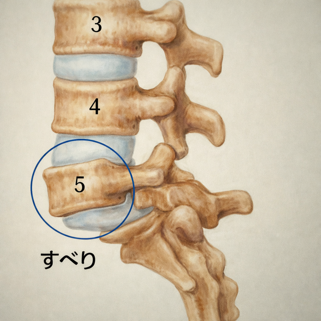 すべり症は、骨がずれているという形の問題だけでなく、背骨を支える仕組みがうまく働かなくなった結果として症状が出る状態です。
