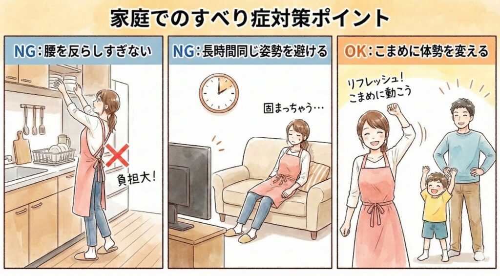 - 家庭では、腰を反らしすぎる姿勢や、長時間同じ姿勢を続けることを避け、こまめに体勢を変えることが勧められる。