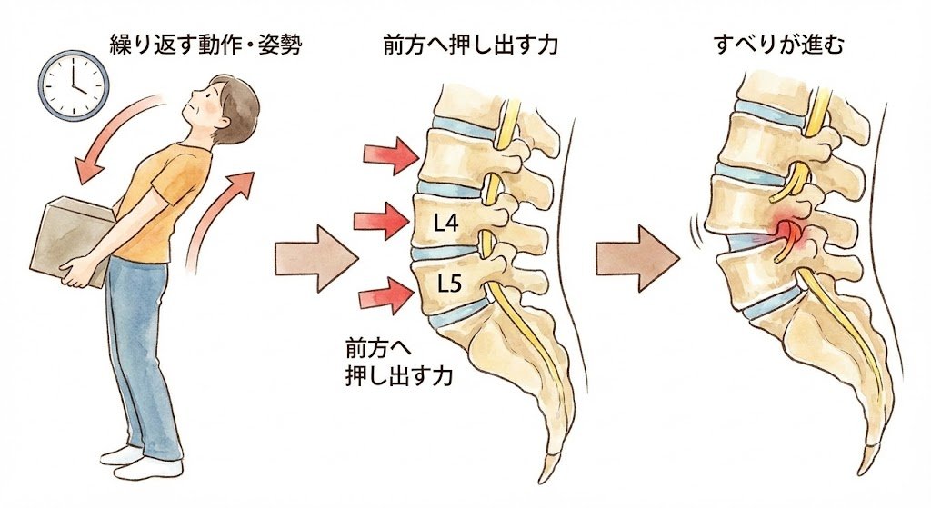 - 腰を反らす動作や、反った姿勢を長く保つ生活習慣が続くと、腰椎の前方へ押し出す力が繰り返し加わり、すべりが進みやすくなる。