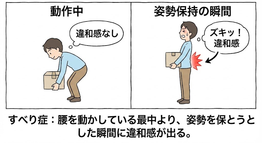 - 腰を動かしている最中より、姿勢を保とうとした瞬間に違和感が出やすい。