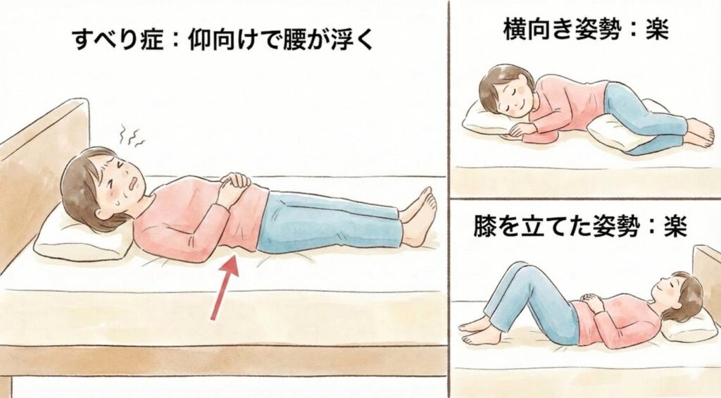 ✅仰向けで寝ていると腰が浮く感じがして落ち着かず、横向きや膝を立てた姿勢のほうが楽。