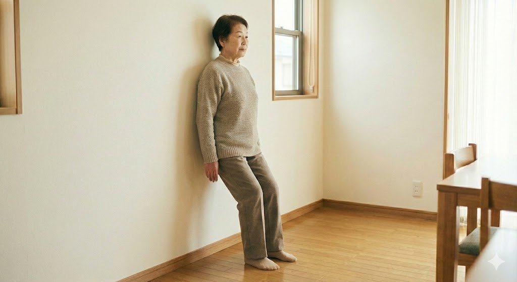 - 壁に背中を軽くつけ、かかとは壁から5〜10cmほど離して床につけたまま膝を少し曲げて戻す。腰を反らさず、背中と骨盤の位置を保ったまま行うことで、立位で腰椎を安定させる感覚を高齢者でも安全に練習できる。