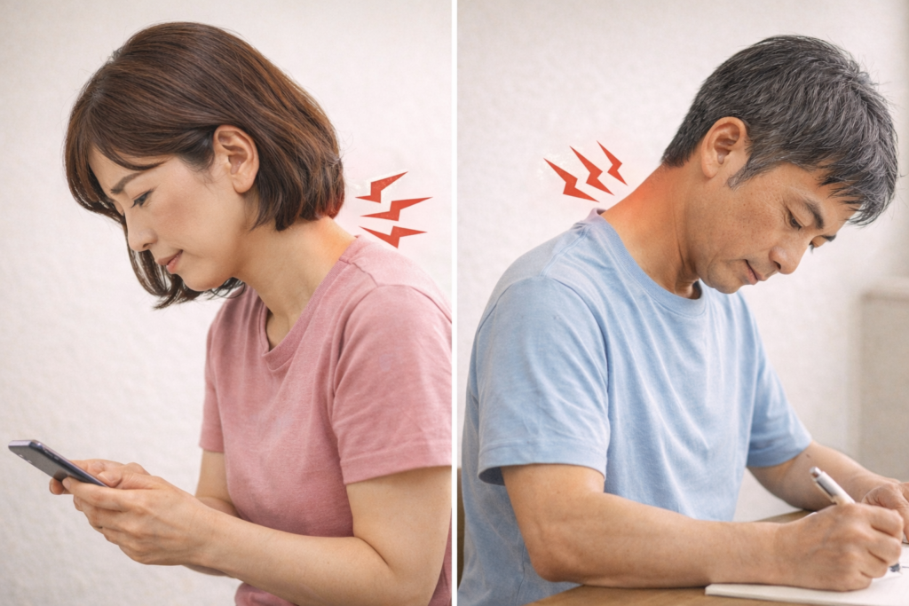 - 首を前に突き出す姿勢や、下を向いたままの作業が続くと、首の後ろから肩にかけての筋肉が引っぱられ続けます。その結果、筋肉が回復する時間が不足し、緊張が積み重なっていきます。