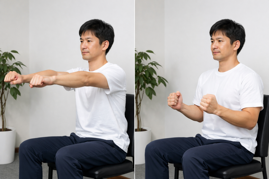 - 椅子に座り、両腕を前に伸ばした状態から、肘を曲げながら腕を体に引き寄せます。肩をすくめず、肘を後ろへ引く意識で行い、戻すときはゆっくり腕を前に出します。 肩こり症では腕の動きに肩甲骨がついてこなくなりやすいため、肩甲骨を腕の動きに参加させ、首や肩だけで支える癖を減らします。
