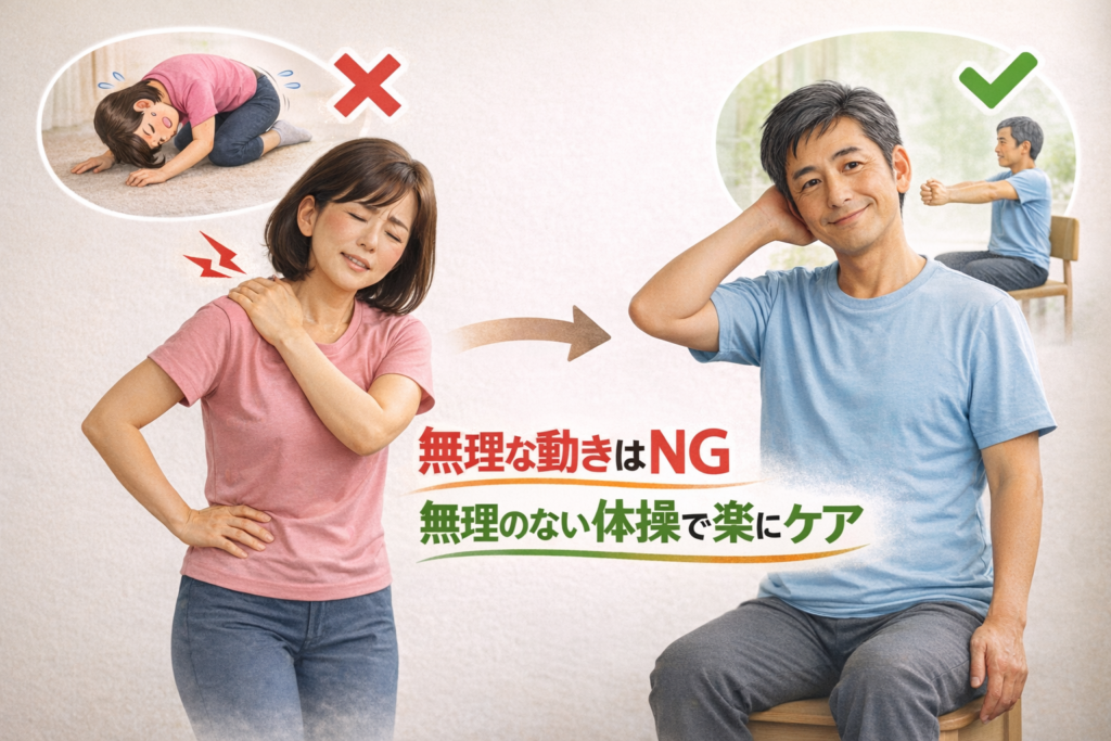強い運動や無理な体操は悪化することがあります。ただし、肩こり症に合った動きであれば、負担を減らす助けになります。