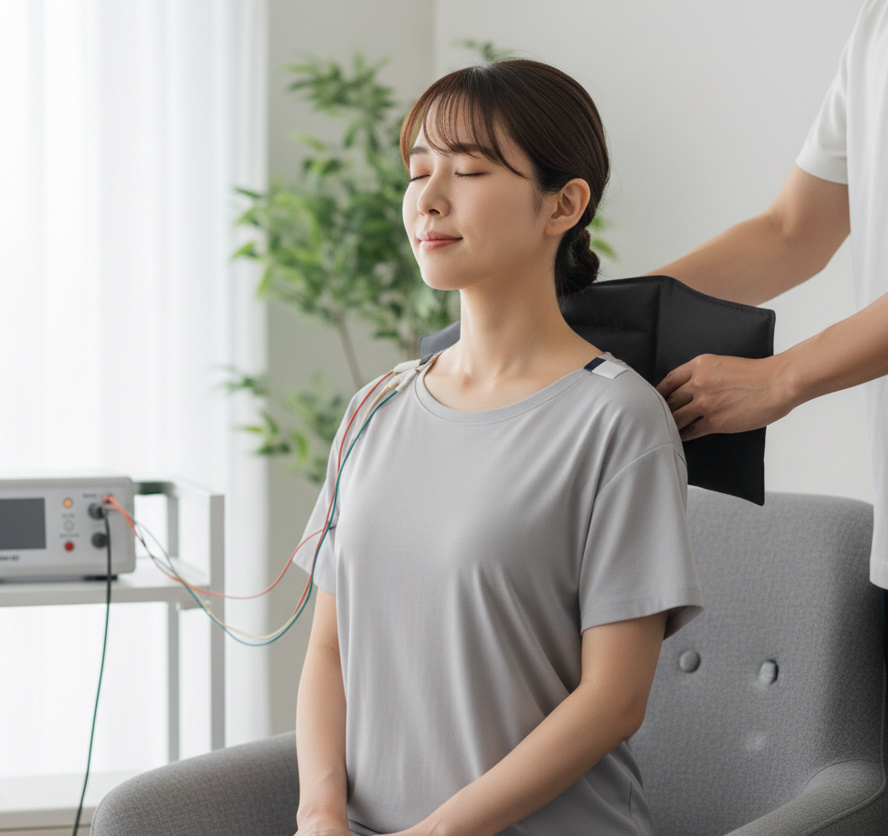 - 温熱療法(ホットパックなど)や電気治療といった物理療法が行われることもあります。肩や首を温めたり刺激を与えたりすることで、血の巡りを助け、筋肉の状態を整える目的で用いられます。