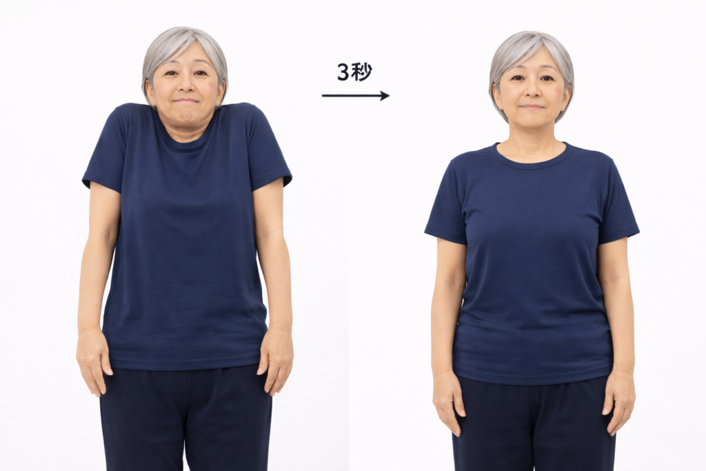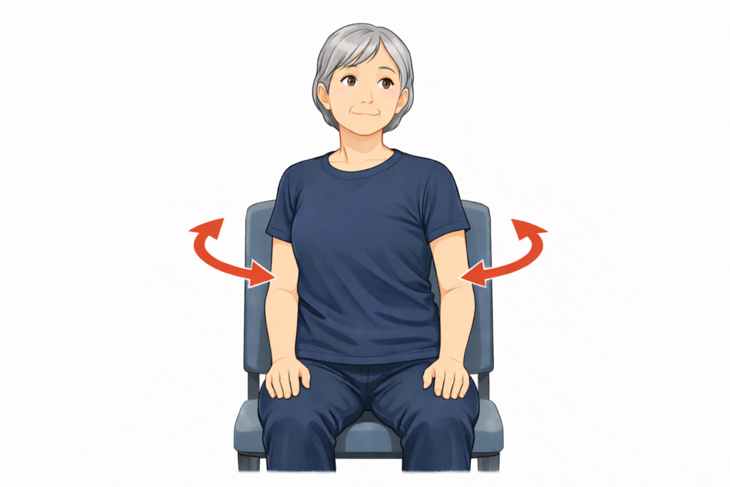 - 椅子に深く座り、両手を太ももに置いたまま、背中を軽く伸ばしてから胸ごと体を左右にゆっくりひねります。首だけを動かさず、目線は正面を保ちます。肩こり症では首だけが先に動きやすくなるため、体と首を分けない動きを取り戻します。